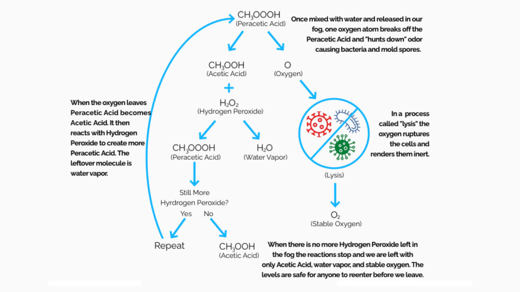 As a common disinfectant, Peracetic Acid does most of the heavy lifting during the treatment. By the time we’re done there will be no traces of Peracetic Acid left in the home.